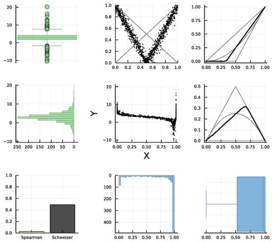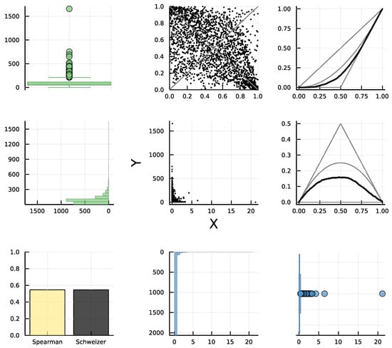 Furthermore, observe that only depends on the copula (e.g., it does not depend on marginal distributions). Also, if and only if , which occurs if and only if X and Y are independent. Note that this desirable unique characterization of independence is not provided by the popular Pearson’s correlation coefficient, for which a zero value does not necessarily imply independence.