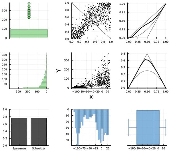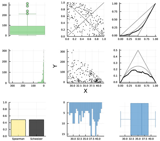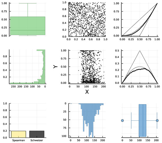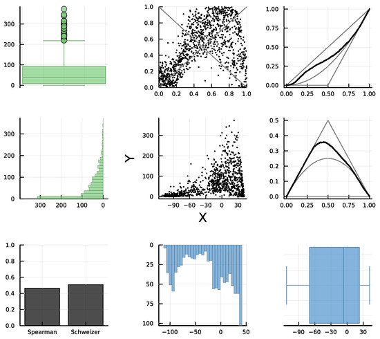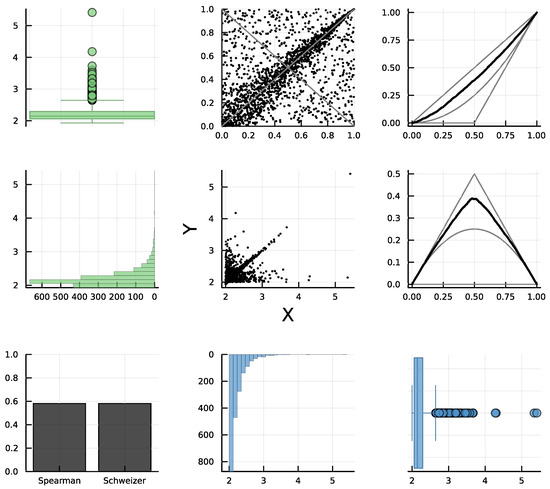 In this example, we used a random subsample of size 1,000 from the “Song Features Dataset - Regressing Popularity” (Spotify Song features) dataset in [49], comparing tempo (X) and acousticness (Y), through the d-plot in Figure 11. This is an example where from both the scatter plot and even the rank plot we may probably be tempted to assess independence at a first glance. For example, the scatter plot appears to be similar to the one in row 5, column 3, of Figure 1. However, note a slight shift to the left of the points in the upper part of the scatter plot compared to the points on the lower part. Also, in the rank plot, there is slightly less density of points on the bottom-left and upper-right corners compared to the density in the upper-left and bottom-right counterparts. Thus, the plots suggest a weak decreasing relationship. This is confirmed by examining the bar chart and diagonal sections. Specifically, not only does Schweizer–Wolff’s dependence measure indicate some dependence (albeit a weak one), in this case, , with , which clearly indicates NQD. Furthermore, the empirical diagonals also suggest NQD, since they lie (slightly) are below their independence counterparts. As a conclusion, this would be an example of weak dependence of type R3 according to Table 1, where by “weak” we mean not to far from R1 but not as clear as the R3 type in Figure 7.