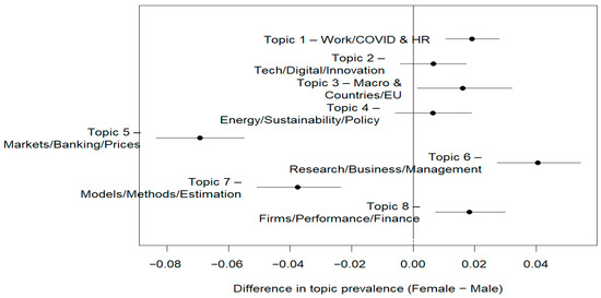 Differences in topic prevalence by first author gender (female versus male). Source: Author’s calculations using R 4.4.3.