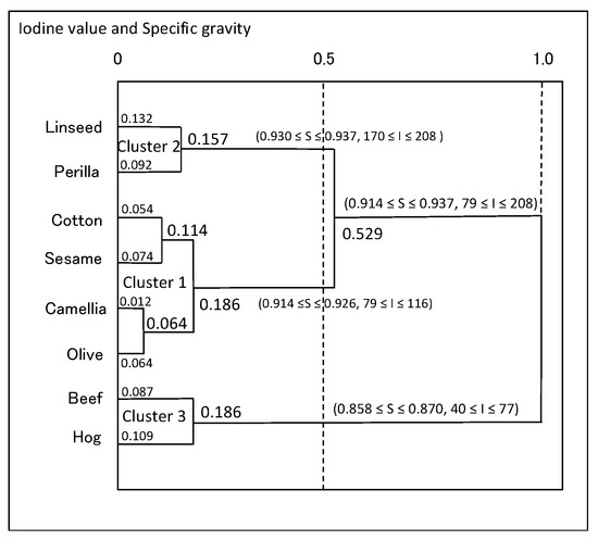 The results of the fats and oils data for iodine value (I) and specific gravity (S).