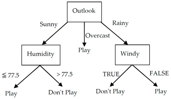 On the other hand, from Table 14, we have C21 = (C, D, E) and C22 = (A, B) with the compactness 0.328 and 0.417, respectively. Subclass C21 is described as “Outlook is Sunny and Humidity = [85, 95]”, and C22 as “Outlook = Rainy and Windy = TRUE”. These class descriptions are easily summarized as the decision tree in Figure 10, where Humidity = 77.5 is the midpoint value between [70, 70] and [85, 95].