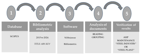 This research selected articles that describe the use of decision-making methods (AHP) with a view to applying the concepts to maintenance management in the steel industry. Five stages have been carried out to achieve this end, as shown in Figure 1.