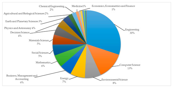 Figure 2 illustrates the subject areas, showing that engineering dominates with 30% of the documents. The other areas of knowledge are classified as Computer Science, Environmental Science, Energy, Business, Management and Accounting, Mathematics, Social Sciences, Materials Science, Decision Sciences, Physics and Astronomy, Earth and Planetary Sciences, Agricultural and Biological Sciences, Chemical Engineering and Medicine.