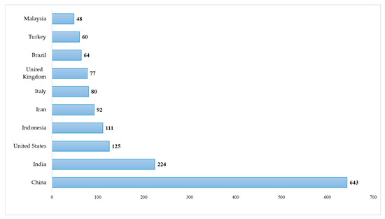 The top ten distribution of authors by country is shown in Figure 3, where China stands out with 643 published articles, followed by India (224), the United States (125), and Indonesia (111). The other countries listed appear with fewer than 100 articles.