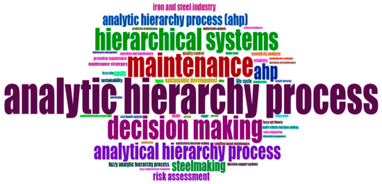 The word cloud is selected from the documents section of R Bibliometrix and highlights the most commonly used terms related to this research. Key terms such as “analytical hierarchy process,” “maintenance,” “decision-making,” and “hierarchical systems” are prominently featured, as shown in Figure 5.