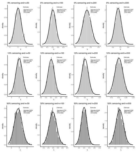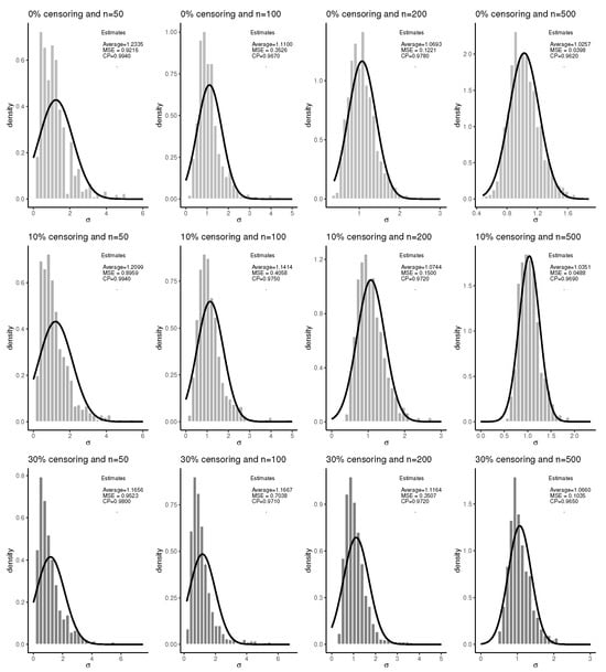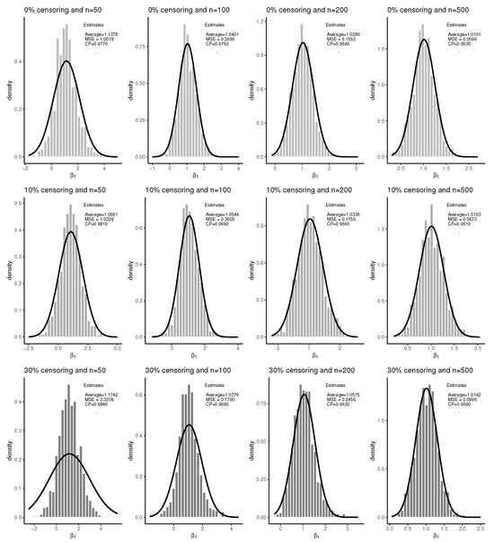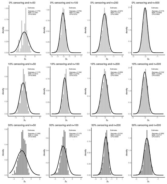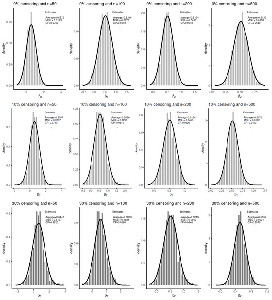 Analysis of the results shown in Figure 1, Figure 2, Figure 3, Figure 4, Figure 5 and Figure 6, referring to Scenario 2—in which data histograms were plotted with normal distribution curves superimposed, along with the values of the average, mean square error (MSE) and coverage probability (CP)—provides evidence of the asymptotic normality of the estimators, regardless of the censoring percentage.