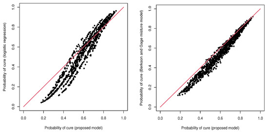 For benchmarking purposes, a logistic regression model and the Weibull Berkson and Gage mixture model were used to classify customers in this data set. The results of the logistic regression (correct predictions of 71.7%, sensitivity of 56.4%, and specificity of 82.4%) and the Berkson and Gage model (correct predictions of 70.2%, sensitivity of 54.4% and specificity of 83.5%) were similar to those of the proposed model. Figure 7 shows the probabilities of cure estimated by the proposed model, logistic regression, and Berkson and Gage mixture model, indicating agreement among these three methodologies.