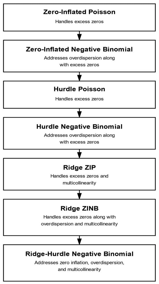 Count data, representing event frequencies across domains such as transportation safety, epidemiology, and insurance, present persistent methodological challenges due to zero-inflation and the presence of multicollinearity. Negative Binomial (NB) regression model serves as the primary framework for count data analysis, incorporating a dispersion parameter that accommodates variance exceeding the mean, a phenomenon known as overdispersion [,]. Despite this flexibility, NB models encounter significant limitations when datasets exhibit zero inflation, characterized by observed zero counts substantially exceeding theoretical expectations under standard distributions [].
