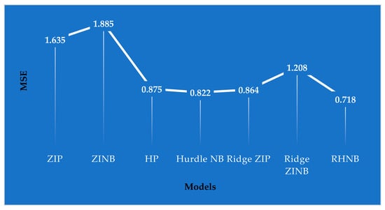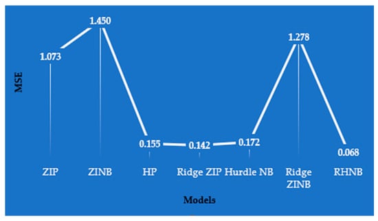 Figure 3 illustrates the MSE values across competing models, where the proposed RHNB model achieves the lowest error (0.718), clearly outperforming both traditional (ZIP, ZINB, HP, Hurdle NB) and regularized (Ridge ZIP, Ridge ZINB) alternatives. This superior performance reinforces the findings from the simulation study, highlighting RHNB’s robustness in handling zero inflation, overdispersion, and multicollinearity in the fish catch data.