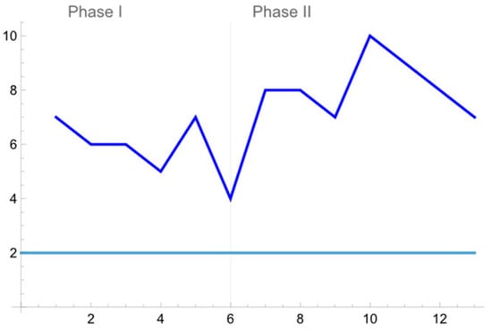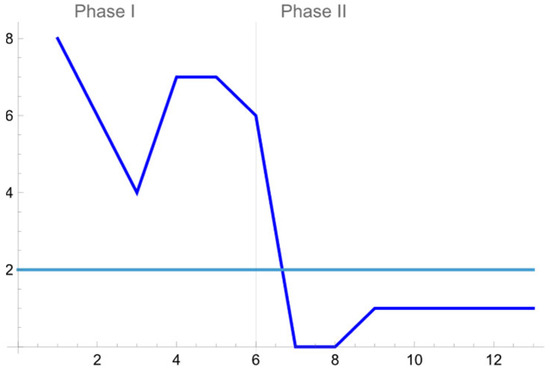 Note that every time that a plotting point is over the horizontal line, which expresses the corresponding control limit, we record a single undesirable measurement. However, under the proposed monitoring scheme, the process is characterized as OOC whenever we observe two subsequences of plotting points of length (or less), while the points contained in each one of them which lie out of control limits should be at least two in order for an OOC signal to be produced.