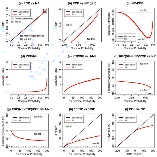 Finally, Figure 1i uses axes in which both the NP and the PCP have been transformed to . For small values of p, this is equivalent to a return period axis, and for large values of p this is equivalent to a return period axis for the return periods of non-exceedance. This is therefore a way to illustrate the reliability bias for both tails of the distribution in one plot.