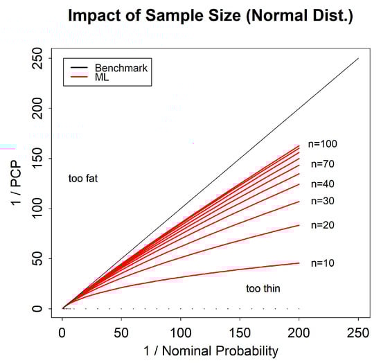 We now consider the effect of sample size on the maximum likelihood reliability bias. Figure 3 shows the tail reliability diagram for the normal distribution for sample sizes from to . We see that the reliability bias reduces as the sample size increases, showing clearly that the reliability bias is a small sample size phenomenon, but that in the extreme tail it is still not negligible even for a sample size of .