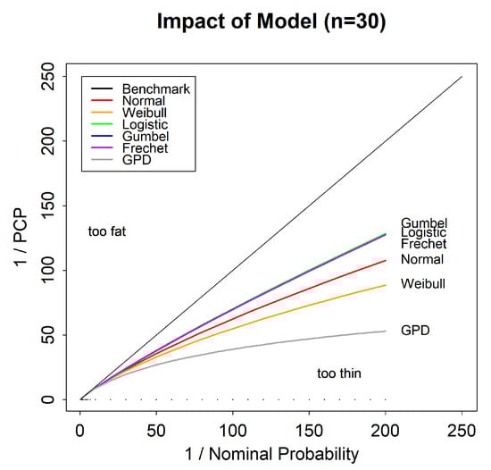 A number of previous authors have quantified the reliability of point estimate predictions using reliability testing. Gerrard and Tsanakas [], in Table 1, give results for the reliability of maximum likelihood predictions for the exponential, Pareto, normal and log-normal distributions. They consider four sample sizes, from to , and NPs of , and . Blanco and Weng [], in Table 1, give results for the reliability of both maximum likelihood and method of moments predictions for the Gamma (for four different parameter settings), normal and log-normal distributions, and for maximum likelihood predictions for the exponential and Pareto distributions. They consider a sample size of , and NPs of , and . More recently, Jewson et al. [] give results for the reliability of maximum likelihood predictions for the exponential, Pareto, normal, log-normal, logistic, Cauchy, Gumbel, Fréchet, Weibull, generalized extreme value (GEV, GEVD) and generalized Pareto (GP, GPD) distributions, for method of moments predictions for the normal and for PWM predictions for the GEVD. They consider a sample size of , and a range of NPs from to . They also explore the impact of different sample sizes and parameter settings on the reliability of GEVD and GPD predictions and evaluate reliability for a number of models that include one or more predictors.
