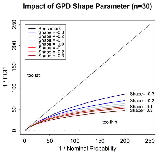 The set of inhomogeneous models includes the gamma, GEVD and GPD, among others. For inhomogeneous models, the results of our simulation testing depend on the parameter values for those parameters that are not part of any transformation group. For example, for the GEVD and GPD, the simulation results do not depend on the location and scale parameters since they are part of a transformation group, but do depend on the shape parameter, which is not. We therefore present GEVD and GPD results as a function of the true shape parameter. If the maximum likelihood estimate of the shape parameter is , then one can consider the reliability of predictions based on the true parameter value as being an approximation to the actual reliability bias. If the reliability bias is highly sensitive to the true parameter value, it may be a bad approximation. If the reliability bias is less sensitive to the true parameter value, it may be a good approximation.