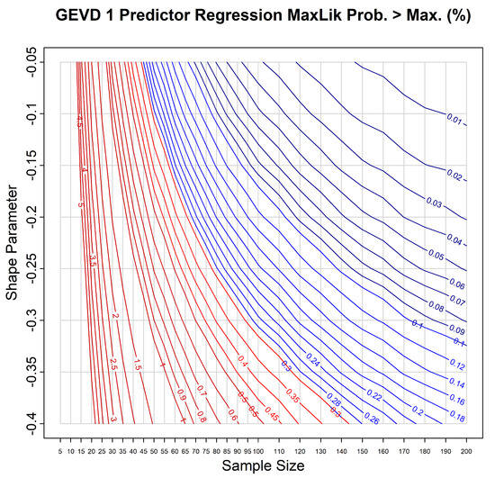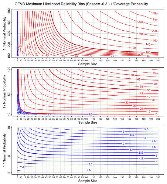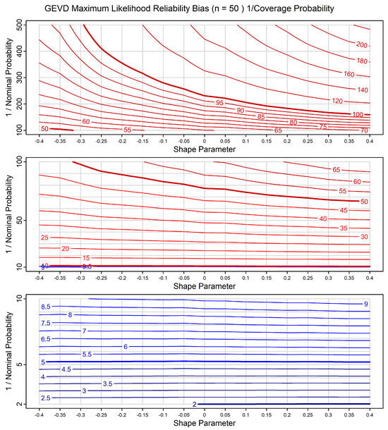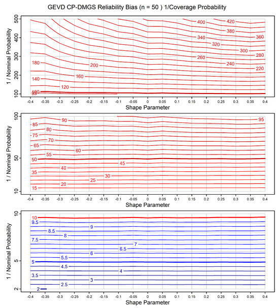 The DMGS equations rely on derivatives of the log-likelihood. However, for the GEVD and GPD, for extreme values of the shape parameter , these derivatives may be difficult to calculate. This can be managed in various ways. Jewson et al. [] used finite difference calculations for the derivatives and found it necessary to eliminate all simulations with estimated shape parameters with an absolute value greater than 0.45. Eliminating simulations in this way introduces a bias in the estimates of the reliability bias, which may be material for small sample sizes and when the true shape parameter has an absolute value close to 0.45. In the current study, we have improved on this approach in two ways. First, we have used analytic expressions for the derivatives, generated using symbolic differentiation. This has allowed us to calculate the derivatives and apply the DMGS equations for all estimated shape parameters with absolute values less than 1. This greatly reduces the number of problematic cases. Second, when the estimated shape parameter has an absolute value greater than or equal to 1, we revert to maximum likelihood prediction, rather than eliminating the case entirely. Reverting to maximum likelihood gives a lower bias than would come from completely eliminating those cases. As a result of this different approach to dealing with extreme values of the estimated shape parameters, the results for the GEVD and the GPD in the present study show small differences relative to those in Jewson et al. [], especially for small sample sizes and relatively extreme true shape parameters. This study should be considered more accurate.