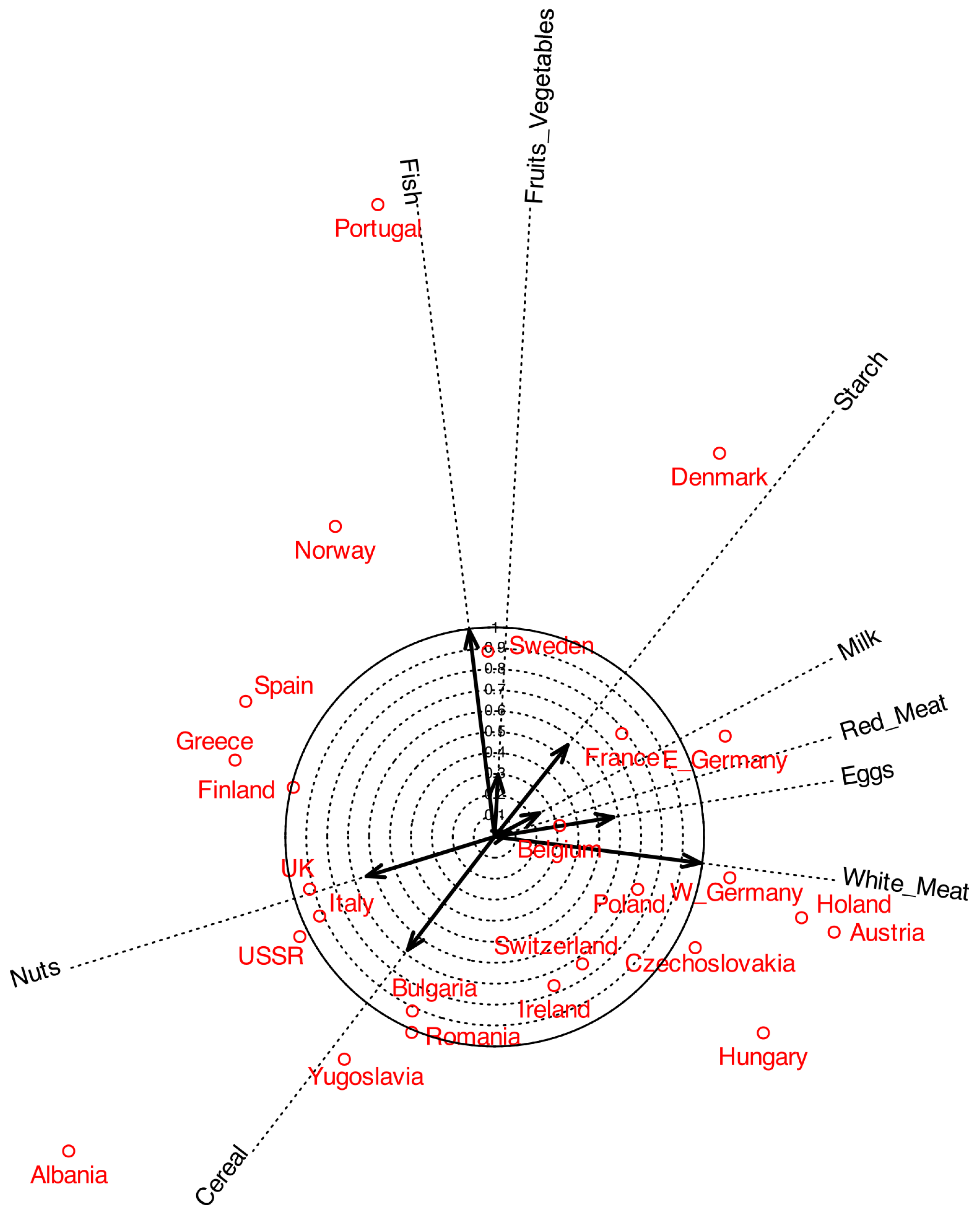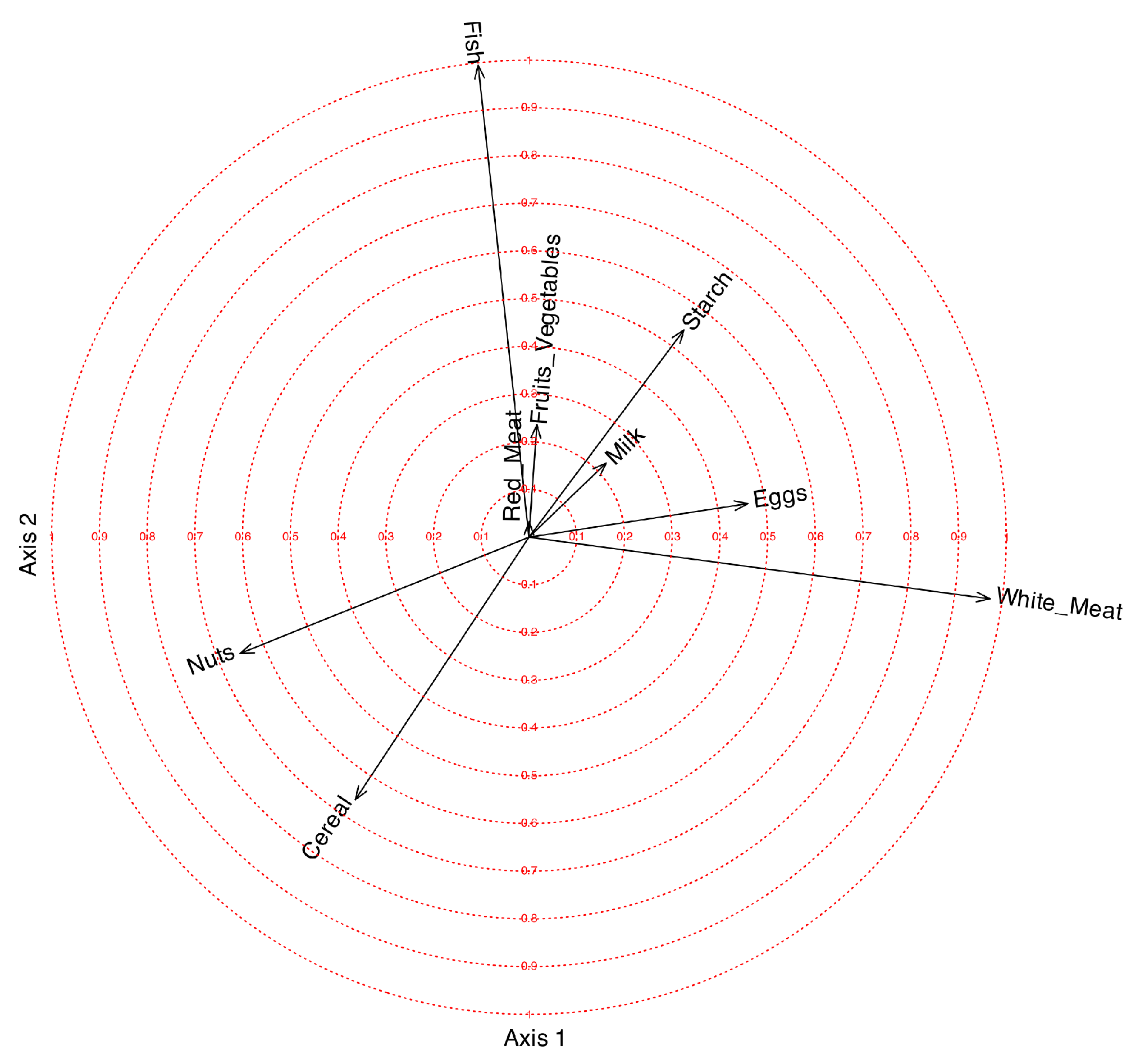 Fish is more closely associated with the second. The length of each arrow represents the multiple correlation with both components. The circles shown in the plot serve as a reference for interpreting both the arrow length and its projection onto the axes.
