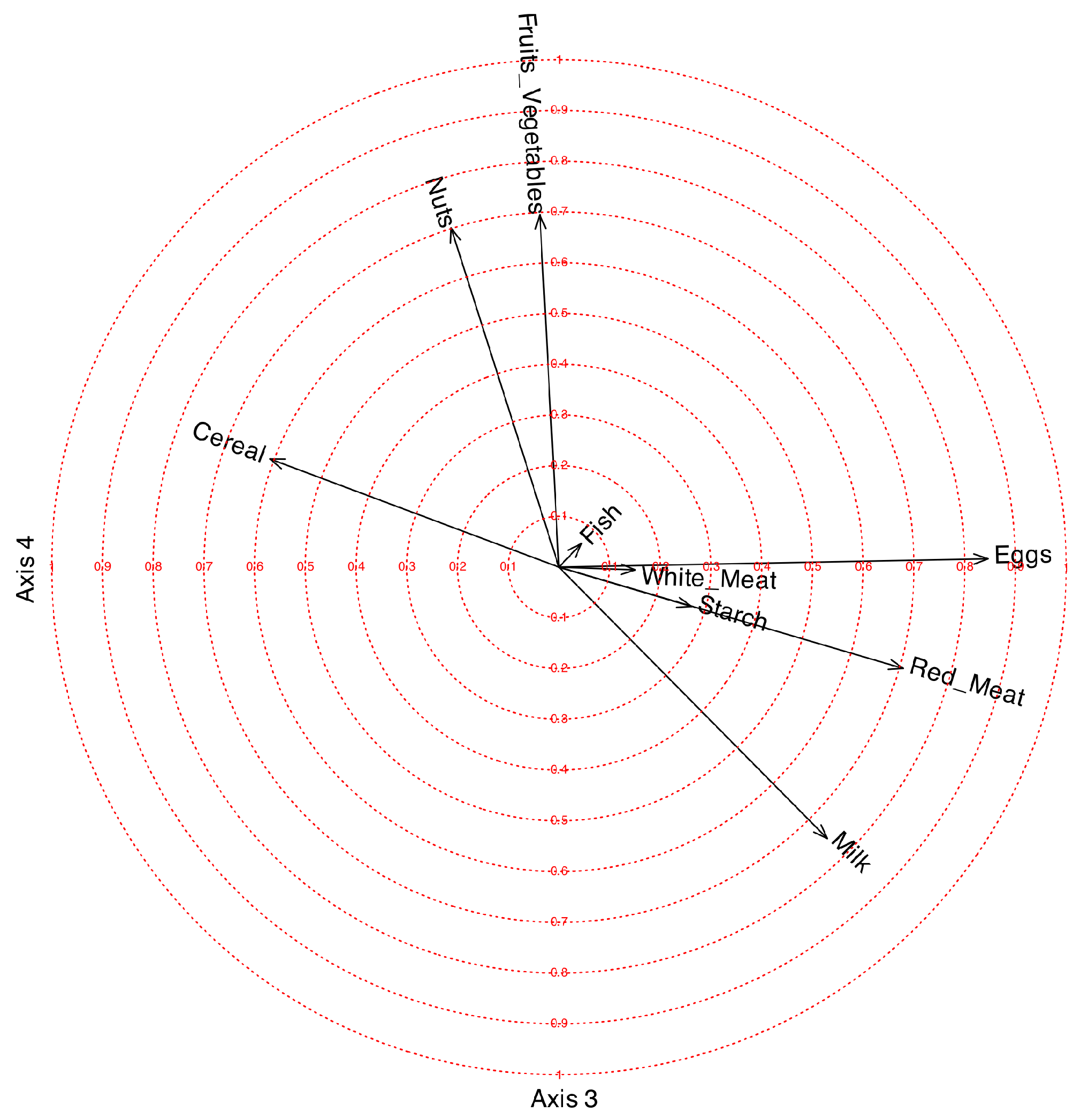 Fruits_Vegetables provide little reliable information in this representation. The latter may instead be better explained by other components. A useful strategy is to remove from the plot those variables with low correlations. For instance, variables with correlations smaller than 0.6 can be excluded to obtain the representation shown in