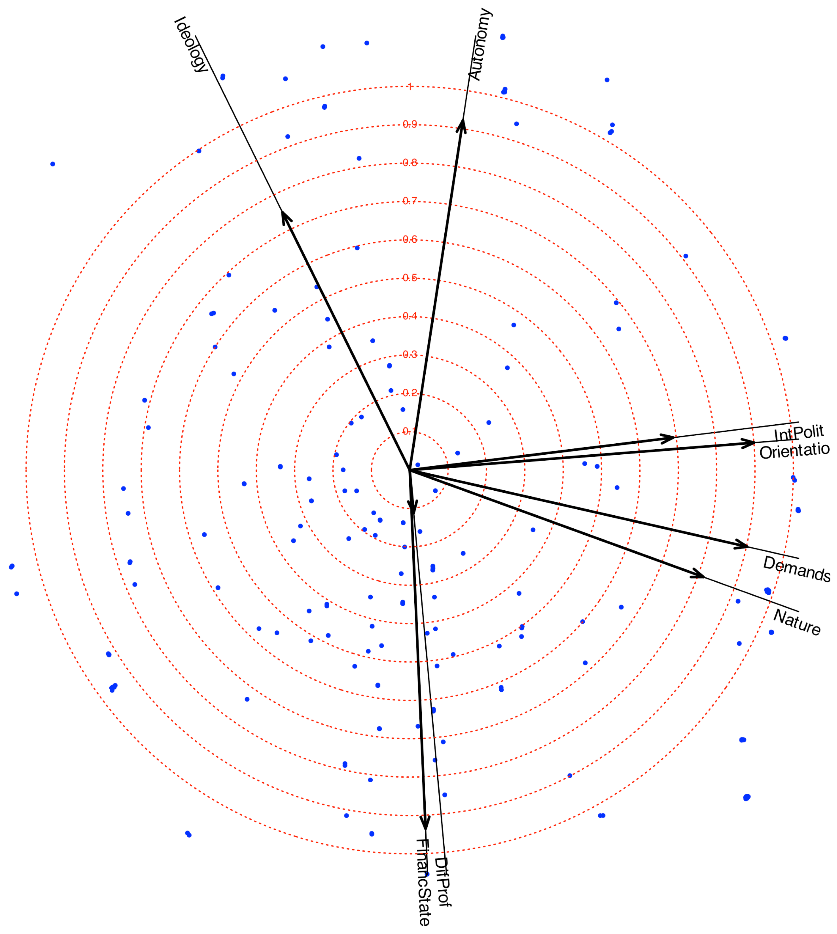 Figure 9 also displays the individuals together with their projections onto the selected variable. This is merely an illustration of how to interpret the biplot. To assess the quality of the predictions, you should refer to the goodness-of-fit indices presented in the article. Points in red correspond to predictions of category 1 (None), whereas points in blue correspond to predictions of category 3 (A lot). The intermediate category 2 (Some) is not represented and is therefore never predicted. When considering all variables jointly, the resulting biplot provides a comprehensive view that facilitates the interpretation of the main structural features of the data.