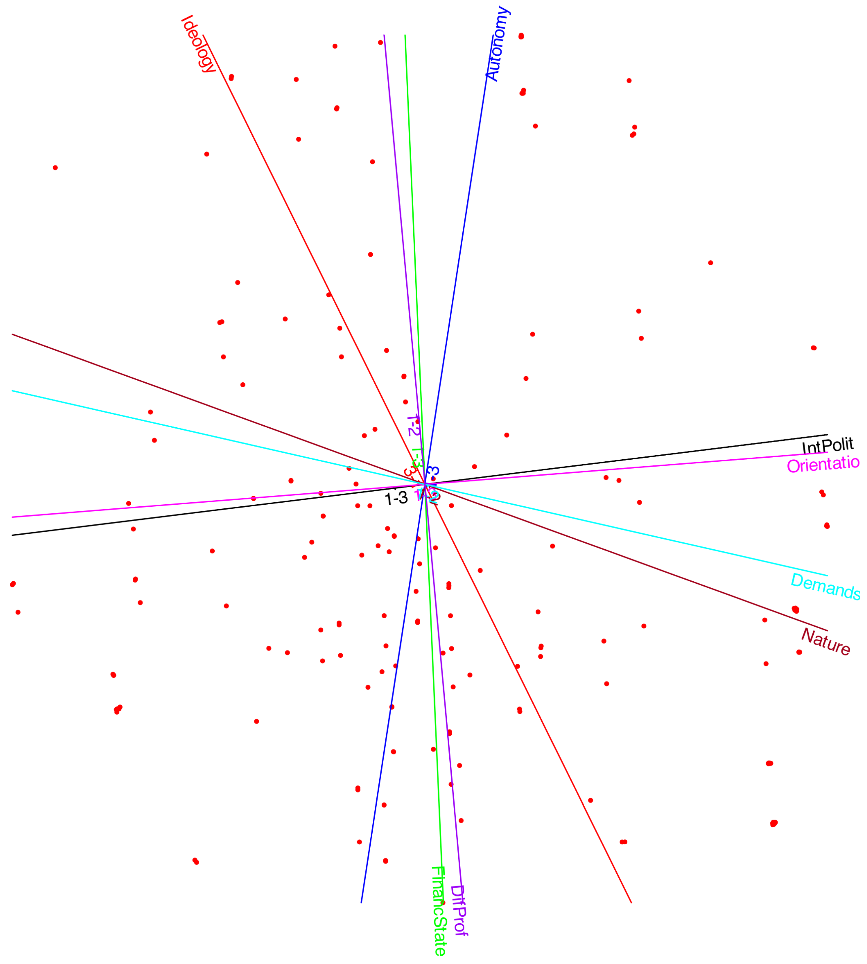 Conversely, Ideology and Autonomy are positively associated, while both are negatively related to State Support. This indicates that individuals on the left of the political spectrum tend to believe that organizations should be both autonomous and supported by the state, whereas those on the right favor autonomy but oppose state financing.