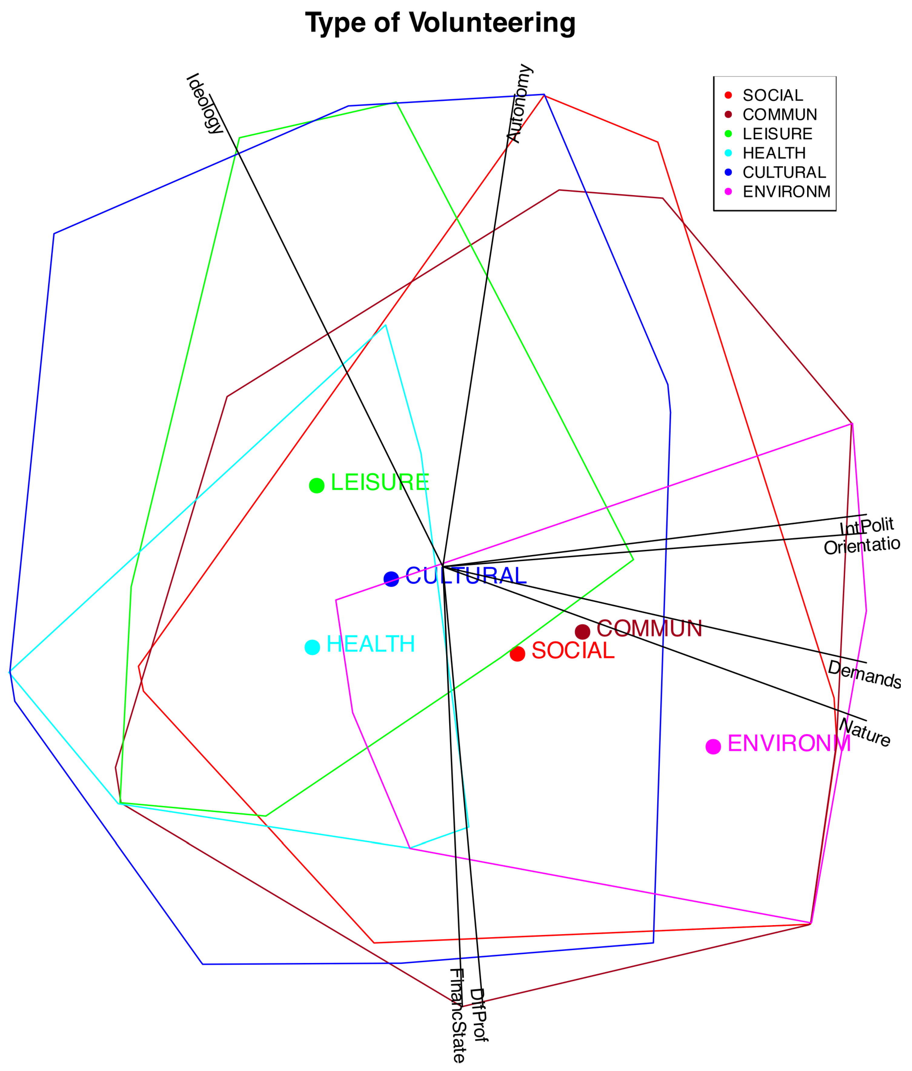 Figure 11 illustrates convex hulls and centroids corresponding to various types of volunteering.