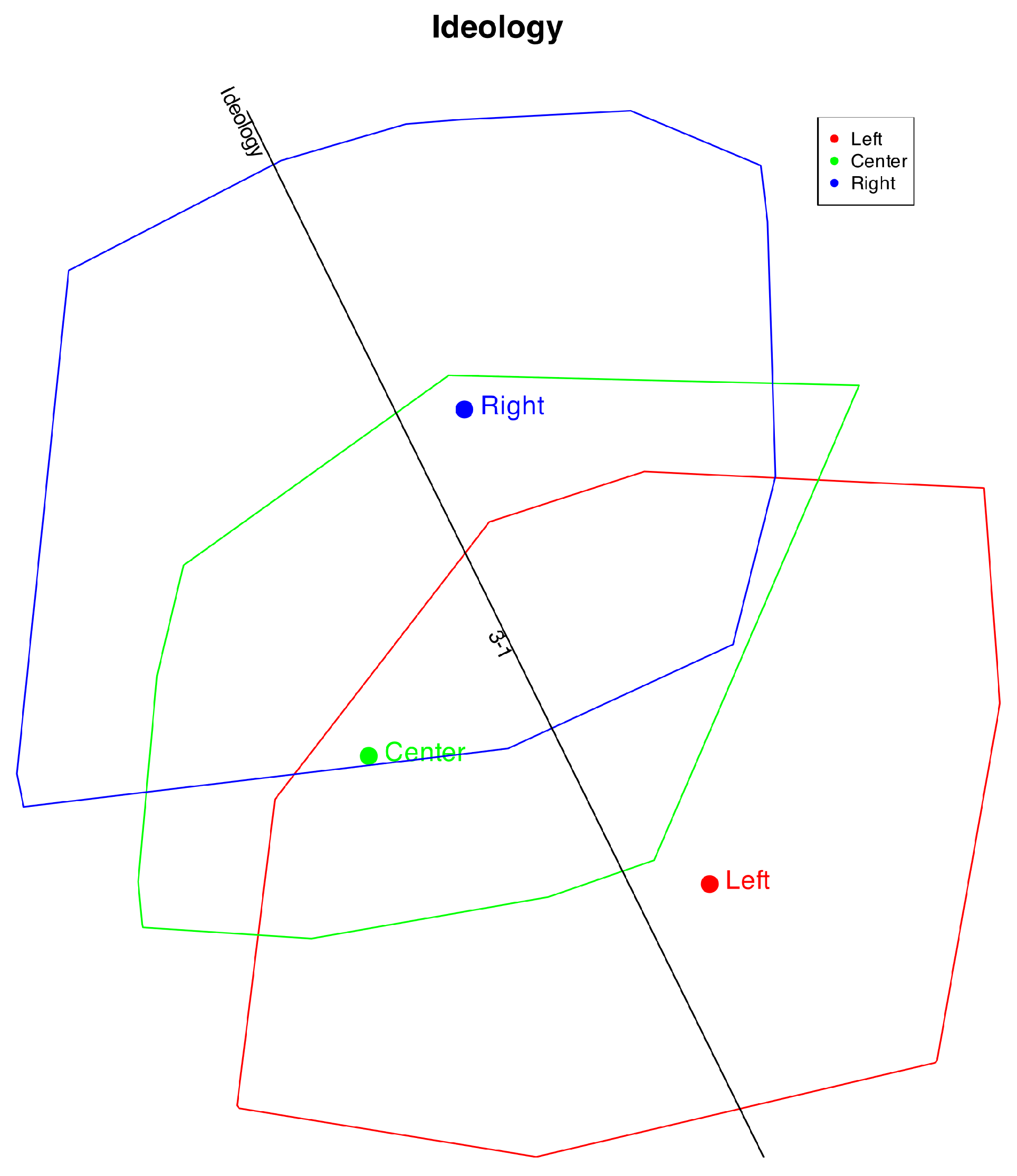 In the prediction, category 2 is never identified; only categories 1 and 3 are predicted, as indicated by the “1–3” mark. Individuals with Right or Left ideologies are mostly classified correctly, while those in the Center are split between the two extremes. Consequently, the overall classification accuracy is slightly lower. Overall, the respondents’ ideologies are well represented in the plot.