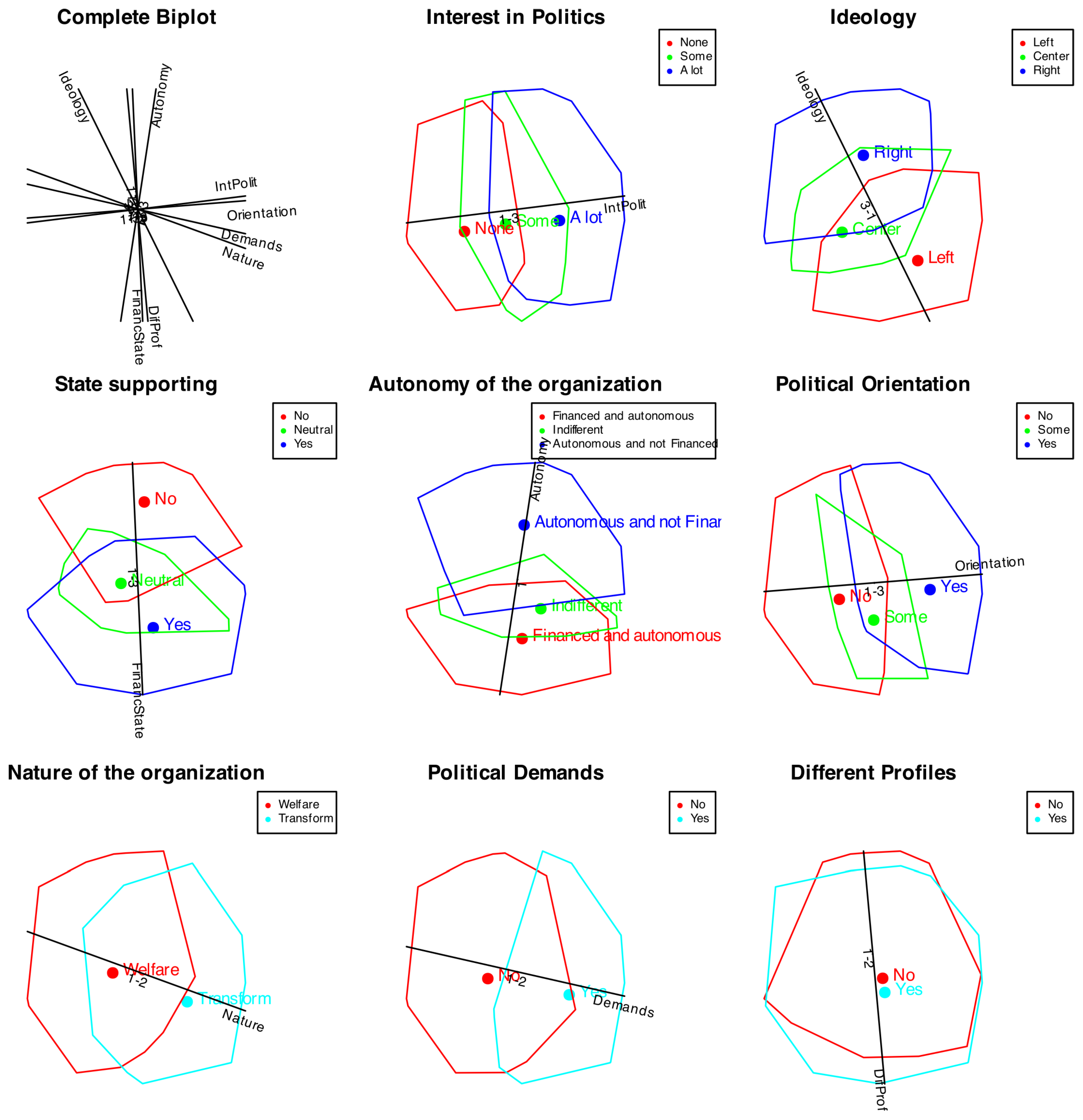 The first factor loaded positively on Interest in Politics, Organizational Orientation, Organizational Nature, and Political Demands, indicating that these variables are strongly interrelated. The second factor showed positive loadings for Ideology and Autonomy, and a negative loading for State Support of the Organization. This pattern suggests that Ideology and Autonomy are positively associated with each other, while both are negatively associated with State Support.