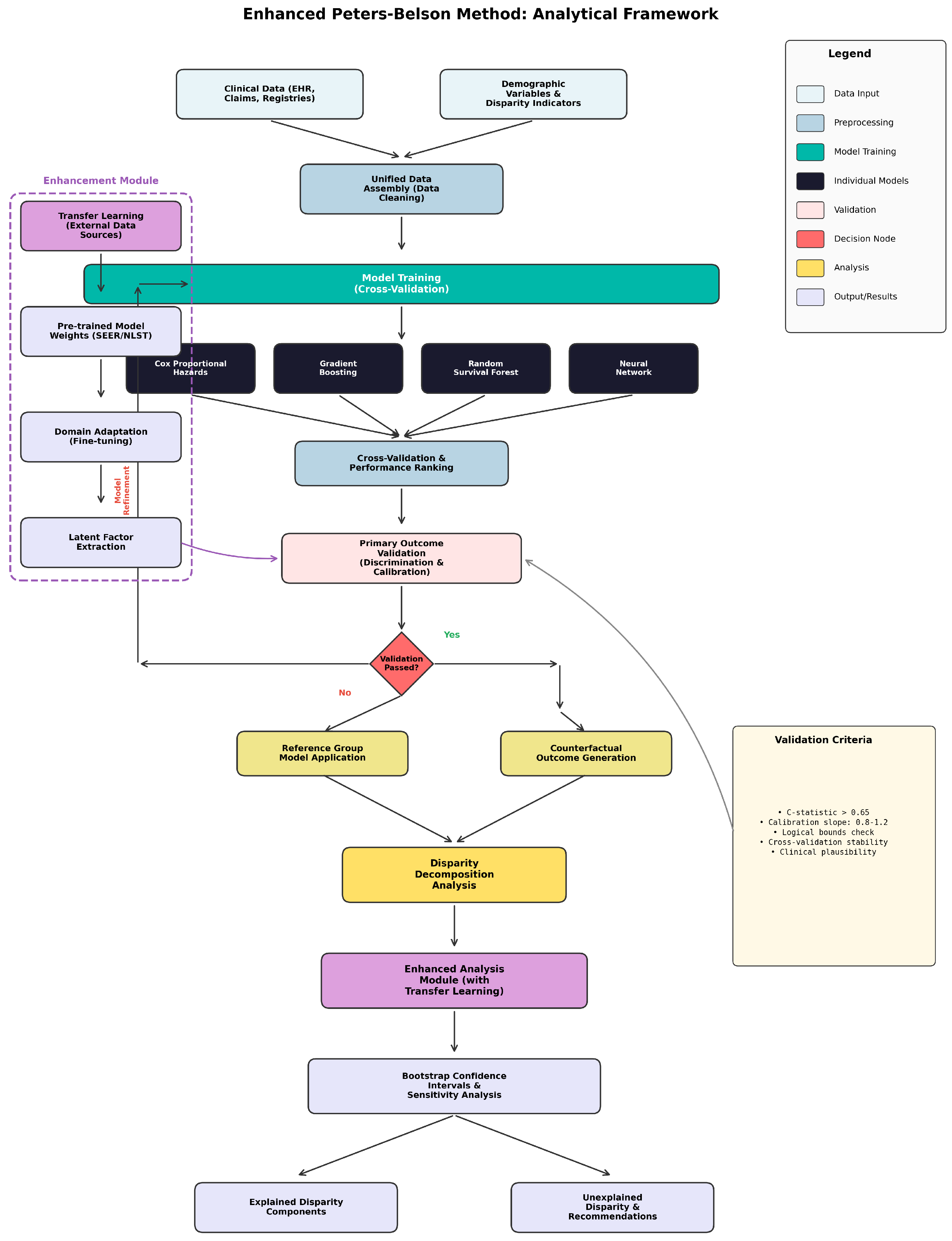 Our validated ensemble framework represents a fundamental advancement in applying machine learning methods to Peters–Belson decomposition while ensuring mathematical validity of counterfactual estimates. The framework integrates multiple survival modeling approaches through a comprehensive validation system that prevents contamination from poorly performing models.