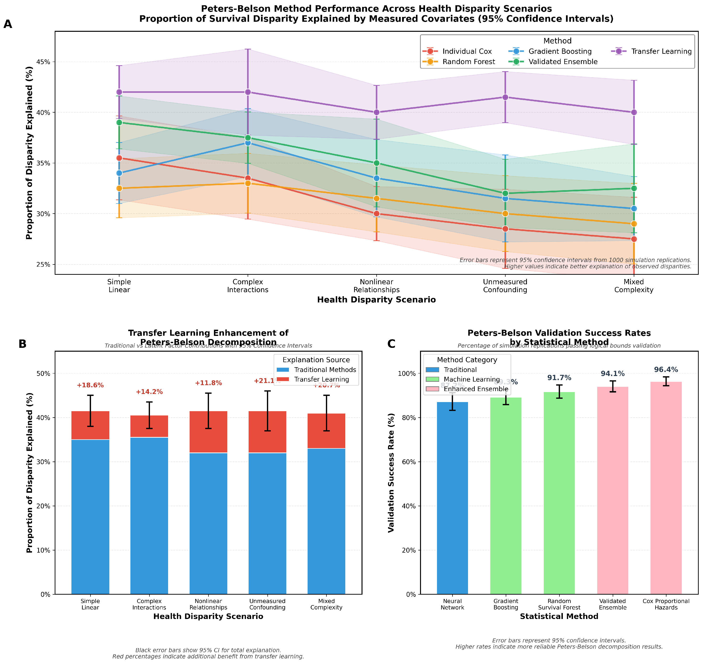 Our main contributions are: (1) a validated ensemble framework that extends Peters–Belson decomposition to survival analysis with comprehensive model validation ensuring logical bounds compliance; (2) development of transfer learning methods that capture group-level latent factors through principal component analysis, providing meaningful improvements when unmeasured confounding exists; (3) implementation of Peters–Belson-specific validation procedures that assess logical bounds compliance and counterfactual validity; (4) systematic evaluation across realistic health disparity scenarios demonstrating when ensemble methods versus individual approaches excel; and (5) development of diagnostic tools that characterize data complexity and provide guidance for method selection based on observable characteristics and validation results.