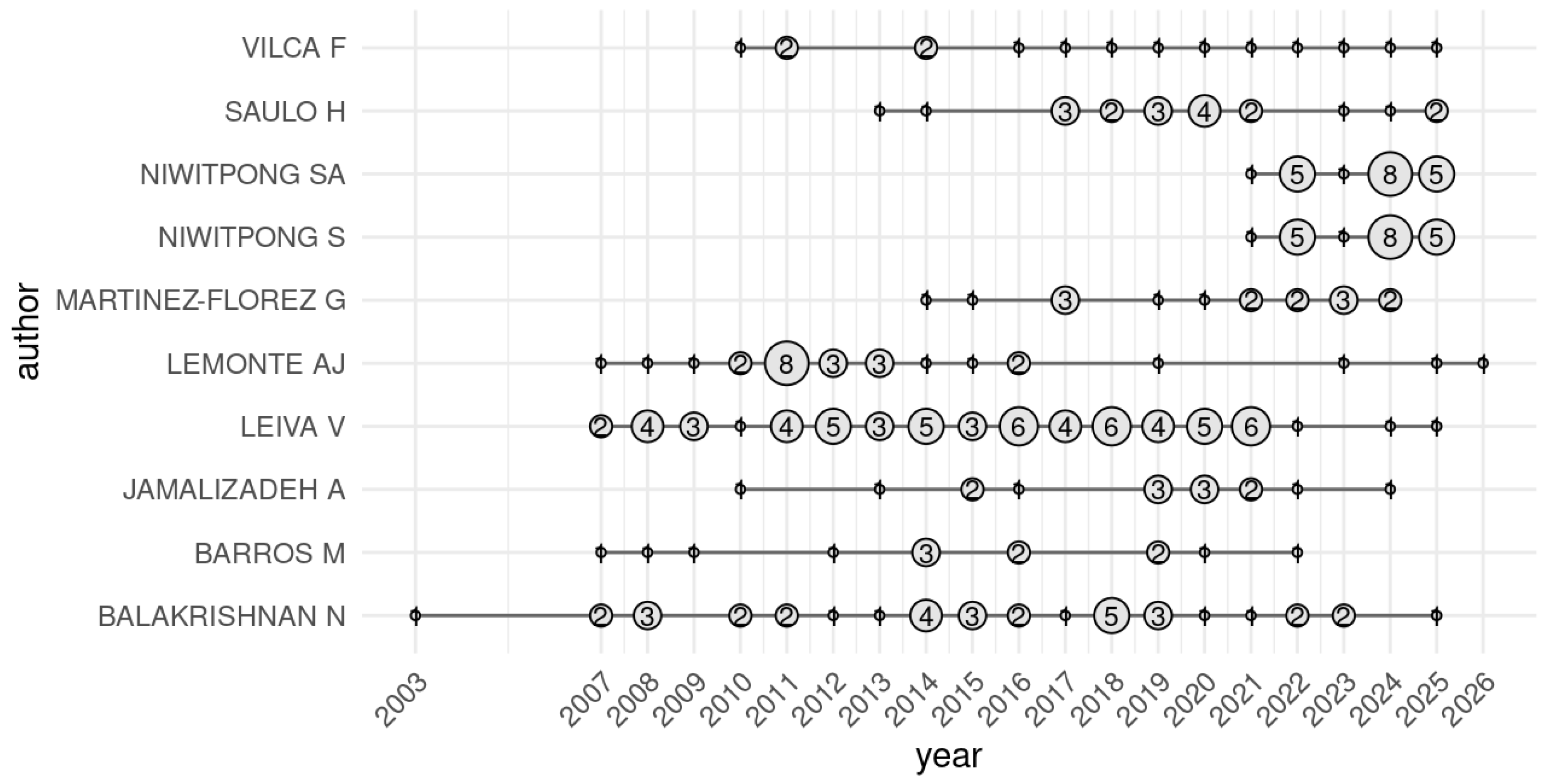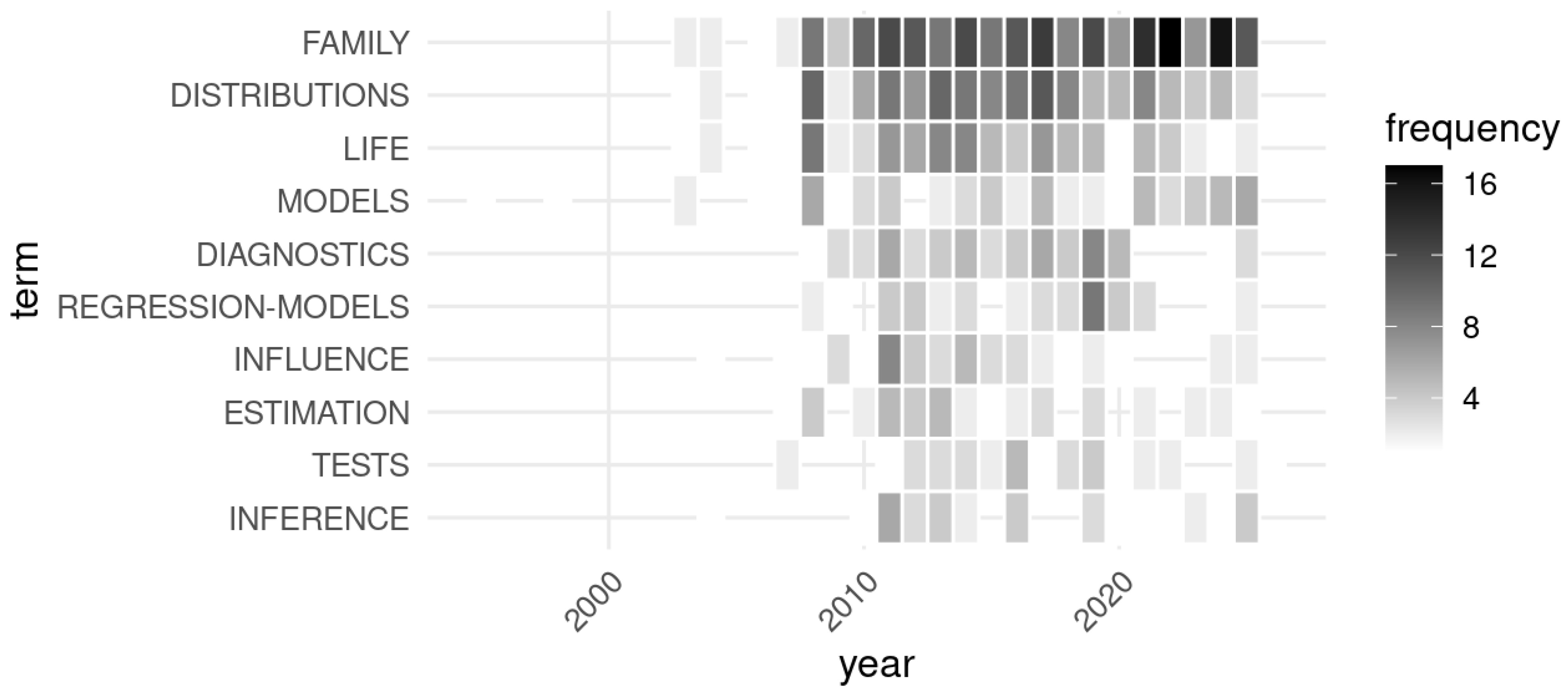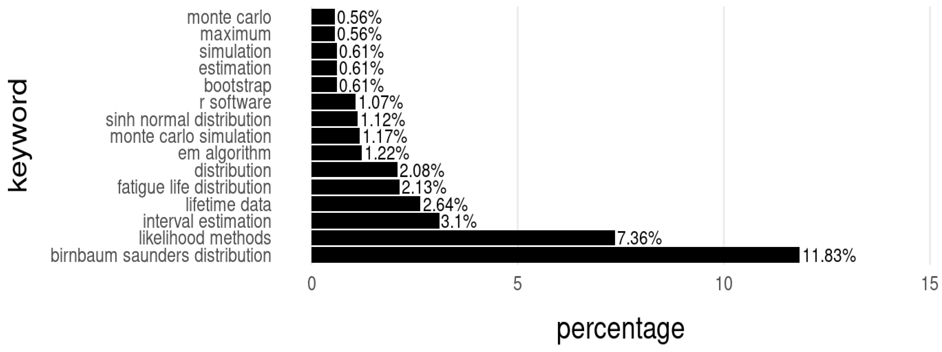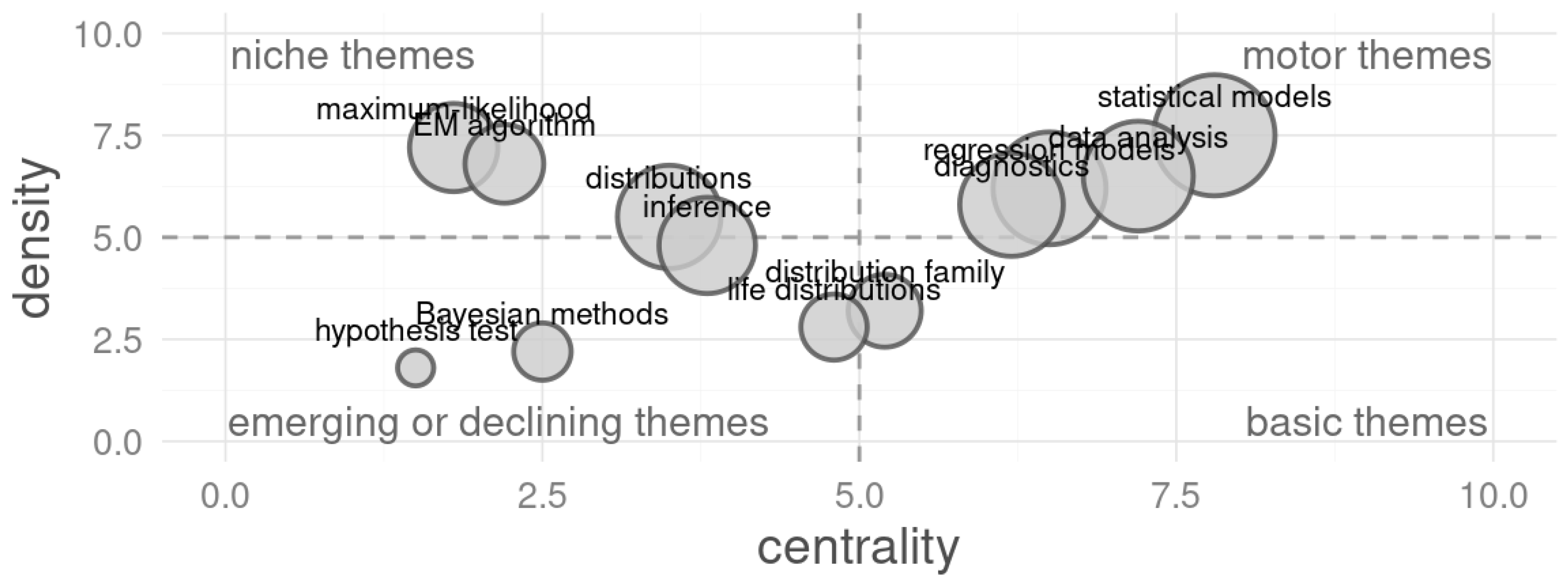 - Fourth quadrant (lower right-basic themes)—This quadrant, which contains topics such as life distributions and distribution family closer to the center, is intended to house themes that are fundamental and essential for the field structure (high centrality) but are less developed (low density). They are the transversal groundwork upon which more specialized and motor themes are built.