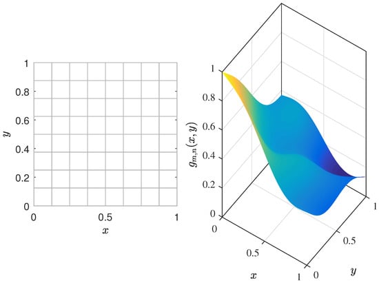 - Case of : The graphical representation illustrates how the operator effectively approximates the identity function in the first variable. The convergence towards the function becomes evident as , demonstrating the operator’s capability to preserve linearity in the -direction. This validates one of the Korovkin-type test conditions for double sequences of operators.