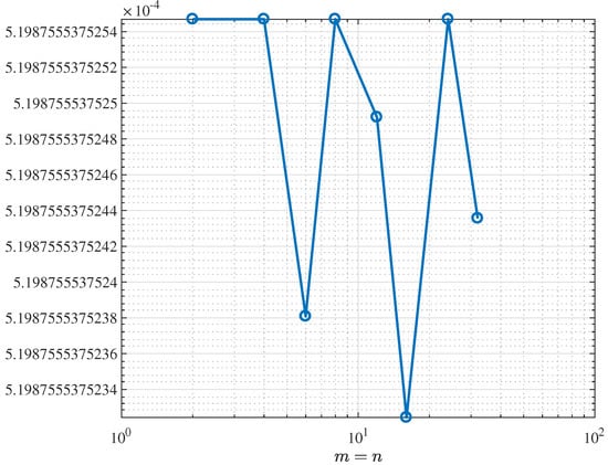 Figure 3 shows how the results converge when m and n are taken to be equal (that is, ). Both axes are shown on a logarithmic scale, so a straight line in the plot indicates a power-law rate of convergence. By focusing on the case , the figure gives a simpler one-dimensional view of the convergence, instead of the full two-dimensional error surface. This makes it easier to estimate how fast the double sequence converges along its diagonal and to compare the observed numerical behavior with any available theoretical error bounds.