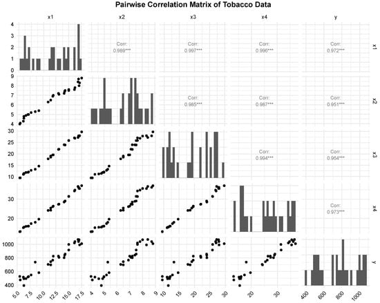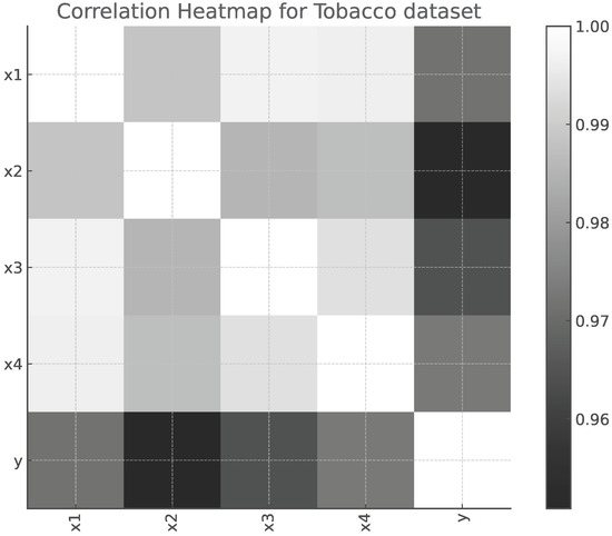 where y represents the heat generated, denote the chemical concentrations, and is the random error term.Figure 1 displays the pairwise correlations among the predictor variables. It can be seen that the predictors are strongly positively correlated with each other, which suggests the presence of multicollinearity. Additionally, in Figure 2, the correlation matrix is displayed as a heatmap, which facilitates quick identification of the pattern and intensity of relationships. The eigenvalues of the correlation matrix are