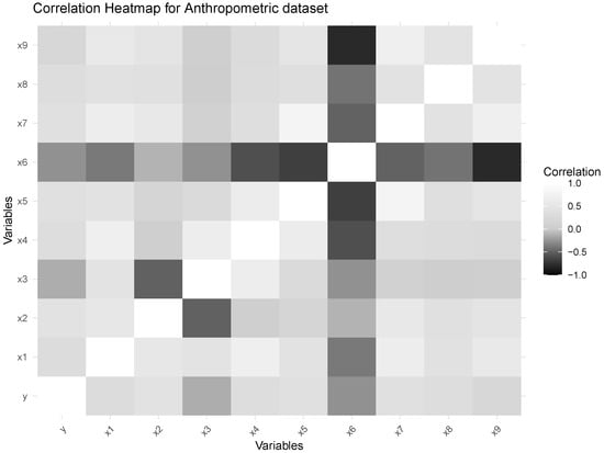 To further evaluate the efficiency of the proposed estimators, we considered another real dataset titled “Anthropometric Data Aged 2–19”, which contains anthropometric measurements for individuals aged between 2 and 19 years. The dataset is available in Aslam, Muhammad (2020) [“Anthropometric-Data-Aged-2-19-Pak”, Mendeley Data, V1, doi: 10.17632/sxgymx5xjm.] and can be accessed from: https://data.mendeley.com/datasets/sxgymx5xjm/1 (accessed on 8 November 2025). The dataset includes the predictor variables like waist circumference (WC, cm), height for age (HpC, cm), mid–upper arm circumference (MUAC, cm), neck circumference (NC, cm), wrist circumference (WrC, cm), arm–to–height ratio (AHtR), waist–to–hip ratio (WHpR), waist–to–height ratio (WHtR), and hip–to–waist ratio (HWrR). The dependent variable is body mass index (BMI, kg/m2). To investigate the relationships among the predictors, a correlation matrix was constructed, and depicted in Figure 5. The figure clearly illustrates that the explanatory variables are highly correlated with one another, suggesting the presence of multicollinearity. The linear associations between the anthropometric variables in the dataset are visually shown by the correlation heatmap in Figure 6, which further confirms the presence of multicollinearity. The boxplot in Figure 7 further confirms the presence of extreme values in the dataset. Moreover, the estimated error variance for the anthropometric data was found to be , which reflects a certain level of random variation or noise in the dataset. The corresponding eigenvalues are