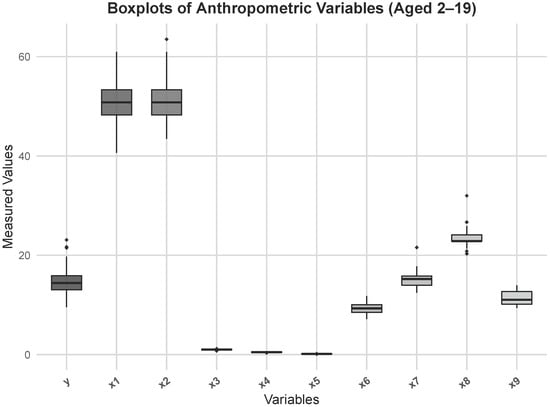 Boxplots of anthropometric variables (Aged 2–19). The points above the boxes represent potential outliers across the anthropometric measures (Data values are standardized for comparability).