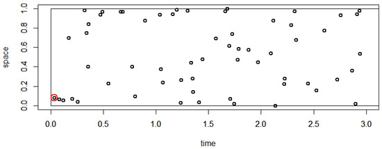 Consider the point process on . From this process, we construct a spatio-temporal process. To each point in an instance of the point process , we randomly select a number in according to a uniform distribution. The number selected for a specific point is considered as the time at which the point is created. This gives the process . Instead of choosing a random point from the instance of the original point process , we choose the first point in the spatio-temporal point process.