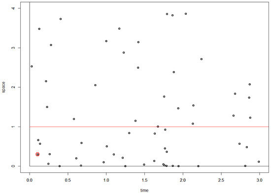Simulation of a spatio-temporal process based on an un-normalized measure with density proportional to . We condition on (indicated by the red line), which has finite measure. A red circle marks the first point in the instance below the red line. The process was stopped at time equal to 3, but it could have been stopped at any time after the marked point had been observed. Note that if we do not restrict to , then the marked point is not the first point. Only values of were included in this simulation, but all points with are irrelevant, for which point we should mark as the first point satisfying .