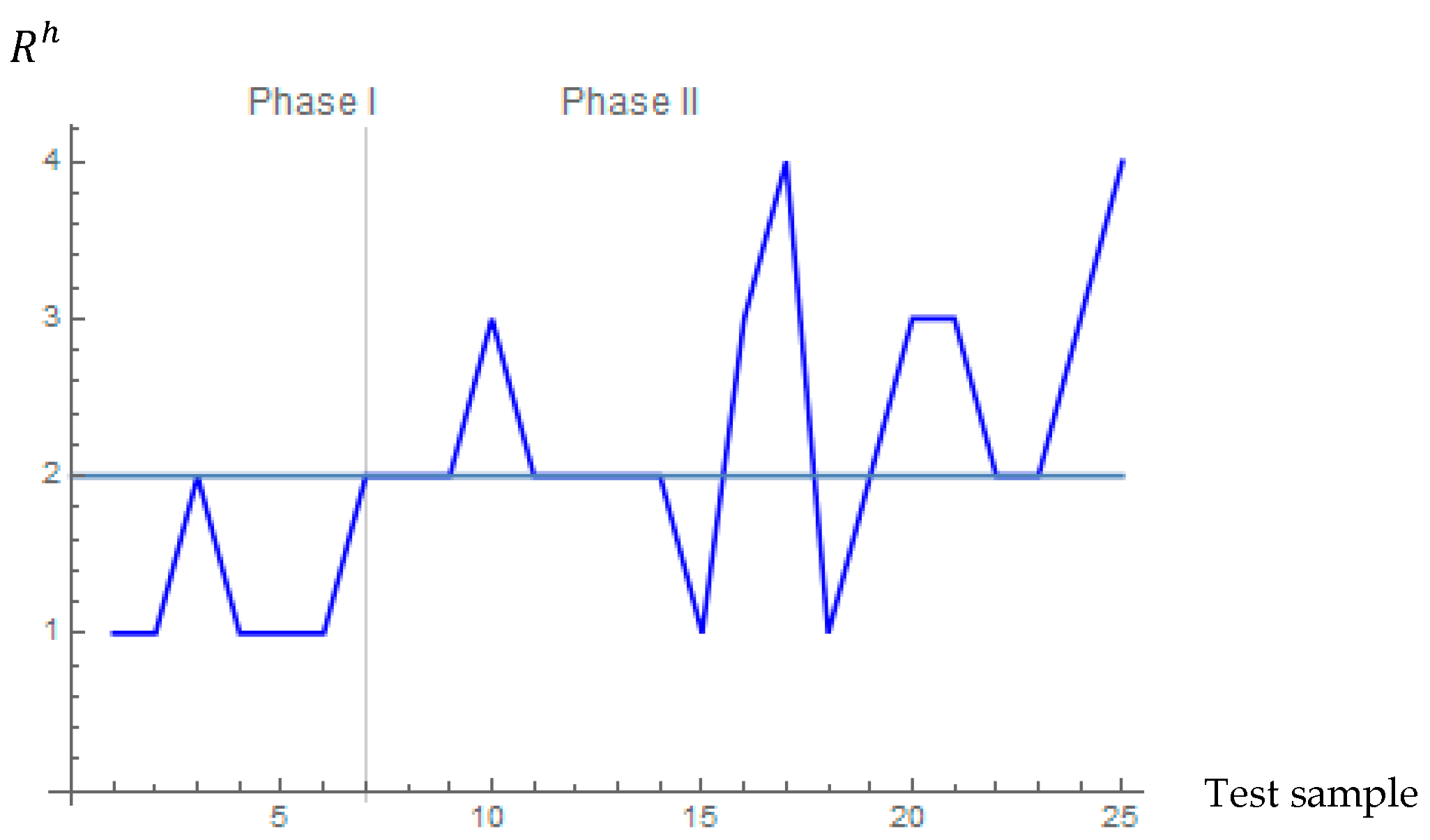 More technically speaking, under the proposed monitoring scheme the process is characterized as OOC whenever we observe rows of bad signals, which practically means that rows of test data sets of length , wherein one or even more than one condition included in (14) has not been met. It is straightforward that Phase I data sets (Days 1 to 49 or equivalently samples 1 to 7) are not creating an OOC signal (as expected due to our knowledge that this period the process was operating well), the suggested distribution-free tool signals in the prospective time period (Day 50 onwards). To be specific, we observe that an out-of-control signal appears upon the 6th test data set (or 13th data set in case we start counting from the beginning of the process) since at that time 2 rows of 2 undesirable signals have already occurred. With the aid of the outcomes mentioned previously, the quality manager can figure out that his/her requirements are not met anymore.