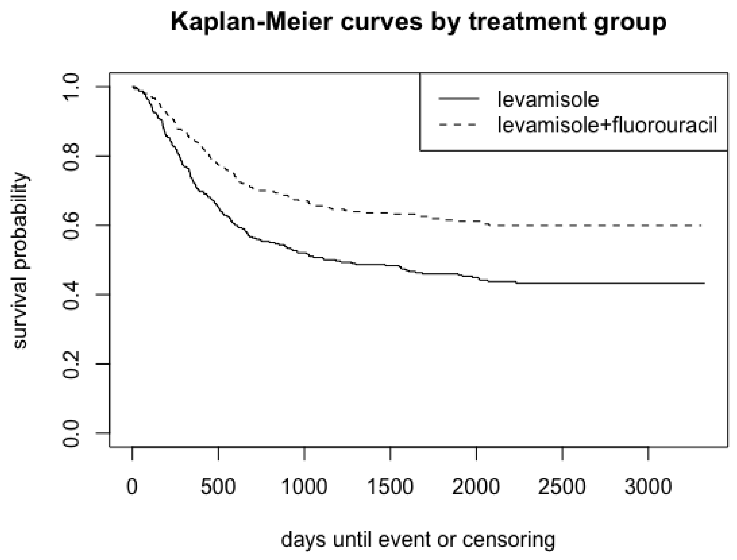 29], which is available in survival package in R. The data set contains 614 patients, among them 310 patients were treated with levamisole (Lev) alone, and 304 patients were treated with the combination of levamisole plus fluorouracil (Lev+5FU). The maximum follow-up time is 3329 days, and the outcome of interest is the days to recurrence. There are 119 and 172 recurrence events in the Lev+5FU therapy and Lev therapy, respectively, and the respective censoring rates are 60.86% and 44.52%. The Kaplan–Meier survival curves for the two treatments are presented in