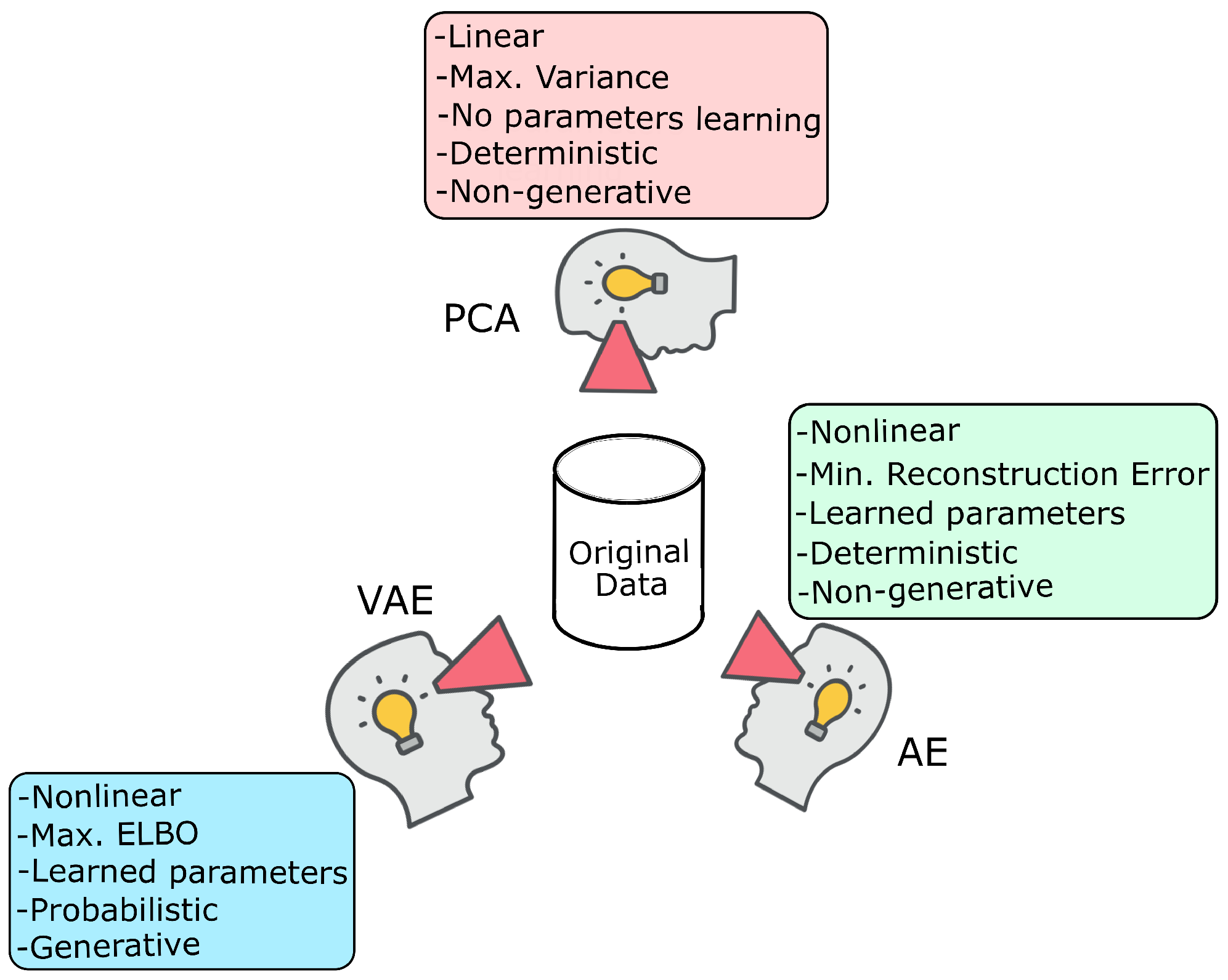 - Generative Capability: This criterion distinguishes descriptive models from generative models. Descriptive models, such as PCA and t-SNE, provide a compressed representation but cannot create new data. In contrast, generative models like VAEs explicitly learn the data distribution, enabling the generation of novel instances.