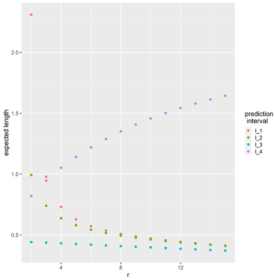In Table 1, the expected lengths of the prediction intervals are shown for the two chosen parameter combinations and for different values of r and s. The prediction interval which uses as a known parameter outperforms , where the first record value is used. Compared with the other intervals, has large expected lengths, which are even increasing in the number of record values used in the prediction method. The asymptotic method tends to have slightly shorter prediction intervals than the exact ones, and . Figure 1 and Figure 2 illustrate the expected lengths of all intervals for and , respectively.