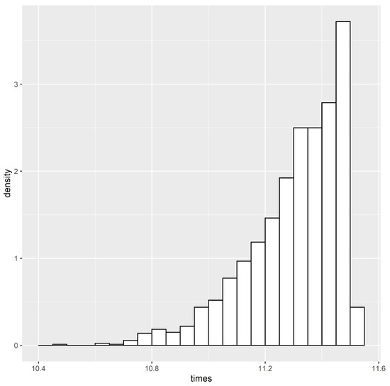 Records play an important role in athletics. We applied statistical prediction methods for future lower and upper record values, namely, future world records, in athletic events, and we focused on the respective next record, i.e., was chosen. We assumed that lower records, as in running events, were based on a power function distribution, and that upper records, as in throwing and jumping events, were based on a Pareto distribution. These assumptions have to be justified in a given data situation. As an example, we considered the women’s 100 m; data of this discipline have been studied by extreme value methods before (Einmahl and Magnus [2], Einmahl and Smeets [4], Stephenson and Tawn [7]). We used the data provided at https://www.worldathletics.org/records/all-time-toplists, accessed on 19 December 2019. These data contain the personal bests of respective athletes, and we considered results until 2018. Since the times were taken with an accuracy of 0.01 s, we further adjusted those times in order to eliminate ties as in Einmahl and Magnus [2]. A histogram of these slightly modified times is given in Figure 3.