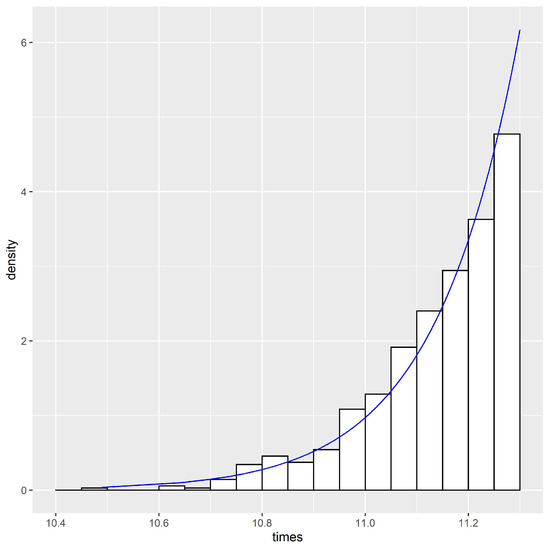 Histogram of the results of women’s 100 m faster than 11.3 s and pdf of the power function distribution with and , where the latter is the maximum likelihood estimate based on all times below 11.3 as upper threshold.