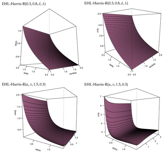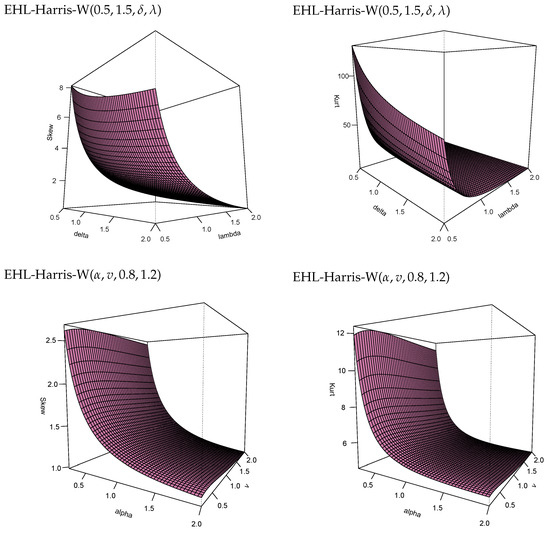 - When and v are fixed, the skewness and kurtosis of EHL-Harris-W are both decreasing functions of and .