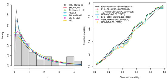 Table 6 indicates that the EHL-Harris-W distribution had the highest p-value for the K–S statistic and the lowest values for all the goodness-of-fit statistics. Thus, we concluded that the EHL-Harris-W model performed better on the survival times of chemotherapy patients data than the non-nested EHL-OL-W, TL-Harris-LLoG, HEBXII, EHL-OBIII-E, OEHL-BXII and HEL models. Further, Figure 8 shows that our model outperformed the competing non-nested models. Figure 10 shows the profile log-likelihood plots for parameters of the EHL-Harris-W distribution on survival times of chemotherapy patients data. This shows that the MLEs of the EHL-Harris-W distribution can be uniquely determined.