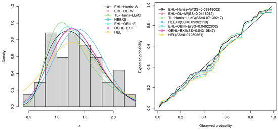 Table 7 indicates that the EHL-Harris-W distribution had the highest p-value for the K-S statistic and the lowest values of all the goodness-of-fit statistics. The EHL-Harris-W model, therefore, worked better with the level of mercury data than did the EHL-OL-W, TL-Harris-LLoG, HEBXII, EHL-OBIII-E, OEHL-BXII and HEL models. In addition, Figure 9 shows that our model outperformed the competing non-nested models on the level of mercury data. Figure 11 shows the profile log-likelihood plots for parameters of the EHL-Harris-W distribution on level of mercury data. This shows that the MLEs of the EHL-Harris-W distribution can be uniquely determined.