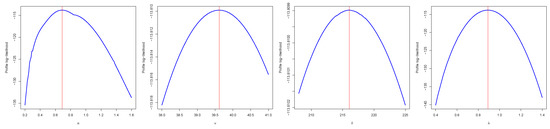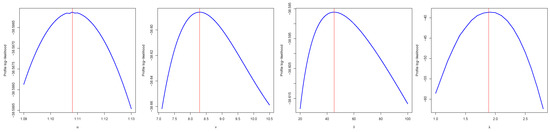 The maximum likelihood estimates (MLEs) of , denoted by , can be obtained by solving the nonlinear system of equations, , numerically with respect to the parameters, using a numerical method, such as the Newton–Raphson procedure, since closed forms of the equations are intractable. The partial derivatives of the log-likelihood function with respect to each component of the parameter vector are given in the Appendix A.