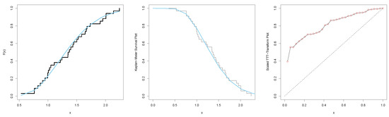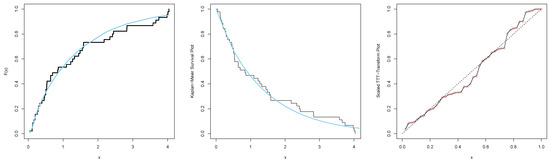 In Figure 12, we see that the cdf line for the EHL-Harris-W distribution, indicated by the blue line, was closer to the empirical cdf, while the survival function in blue was also close to the Kaplan–Meier (K–M) curve, which indicated that our model was the best in explaining the survival times of chemotherapy patients data. The TTT plot for survival times of chemotherapy patients data indicated a non-monotonic hazard rate function; hence, the survival times of chemotherapy patients data can be fitted to our model.