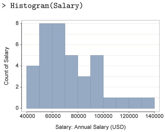 A fundamental data analysis result is the visualization of the estimated distribution of a variable as revealed by its measured values. With unknown origins which date back to at least the 19th century and authors such as by Karl Pearson [1], the histogram has perhaps been the most widely invoked tool for visualization of the distribution of a continuous variable. The histogram groups similar data values into mutually exclusive bins and then places a bar over each bin, with its height relative to the corresponding frequency. To compare to alternatives, Figure 1 shows a histogram of the salary variable computed from 37 data values and created with the lessR package [2], Version 4.3.7, which is discussed in more detail later.