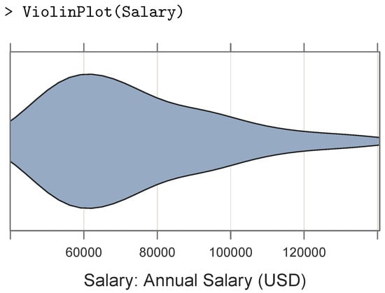 Another issue is that the histogram typically requires a relatively large height relative to its width to express the differences among the bar heights, which works against stacking the histograms on top of each other to compare the distributions of a variable across categorical levels, such as salaries within various departments of a company. One solution to this problem is the violin plot of densities, presented in [5], which is usually much wider than it is tall (or reversed) with the densities mirrored across its principle axis, such as in Figure 2 from lessR.
