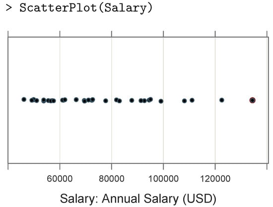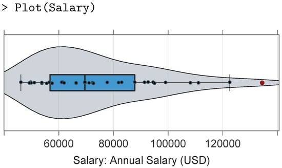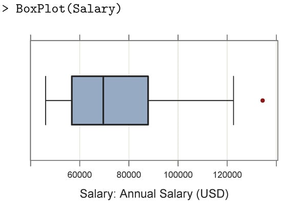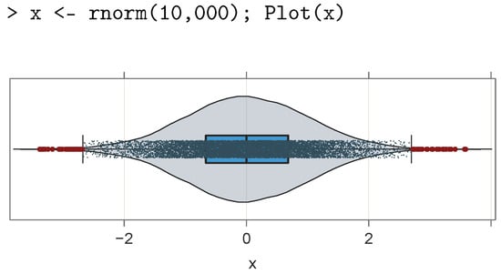 The Plot() function provides statistical analysis as part of the text output to the R console. The accompanying text output for Figure 5 includes the sample size, number of missing values, standard summary statistics, and characteristics of the box plot, such as the quartiles and lower and upper whiskers. Also displayed is a listing of any values tagged as outliers, which are highlighted in the plot by color and size and, if requested, presented with an identifier, such as the row name in the text output. Plot() provides for customization of the standard interquartile range (IQR) multiplier for outlier detection with the parameter k, which defaults to the standard value of 1.5 [6] so that values beyond 1.5 IQRs from the first and third quartiles, which define what are called the fences, are identified as potential outliers, again, at 3 IQRs from these quartiles.